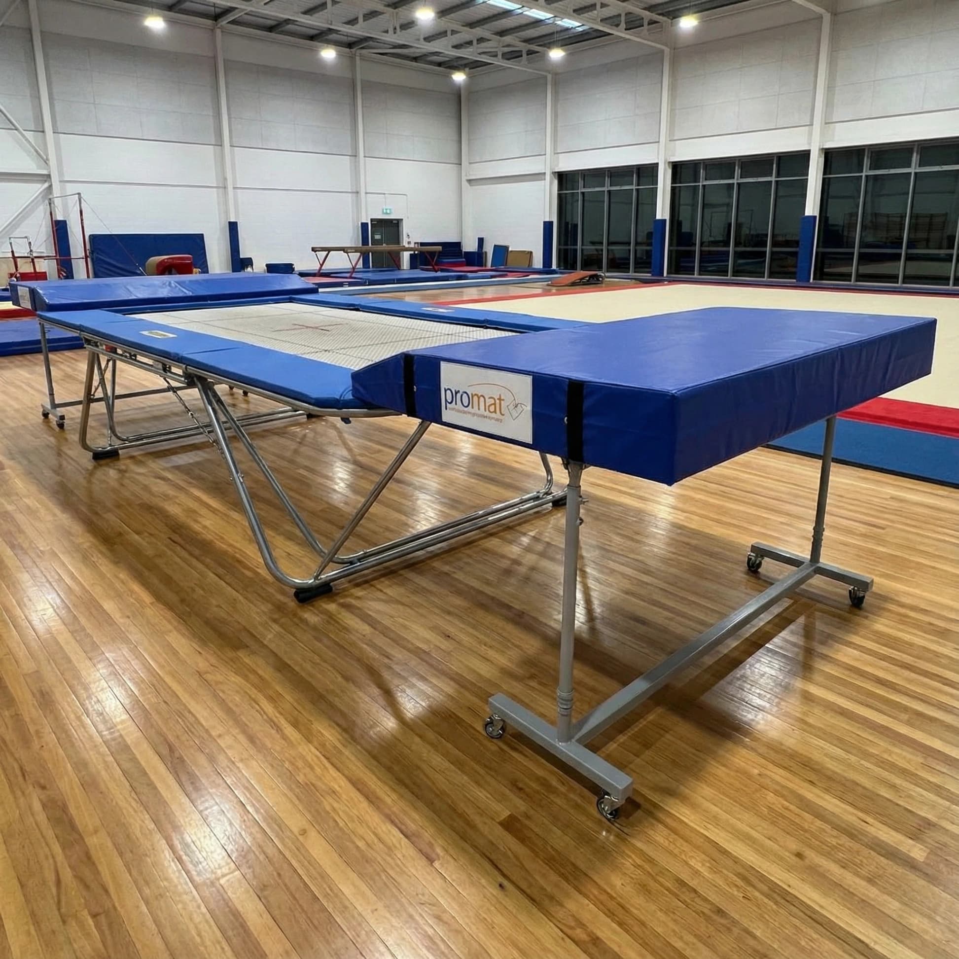Promat Single Wedge End Deck Mat has a wedged edge that assists in protecting the performer if they lose control and fly towards the end of the trampoline.